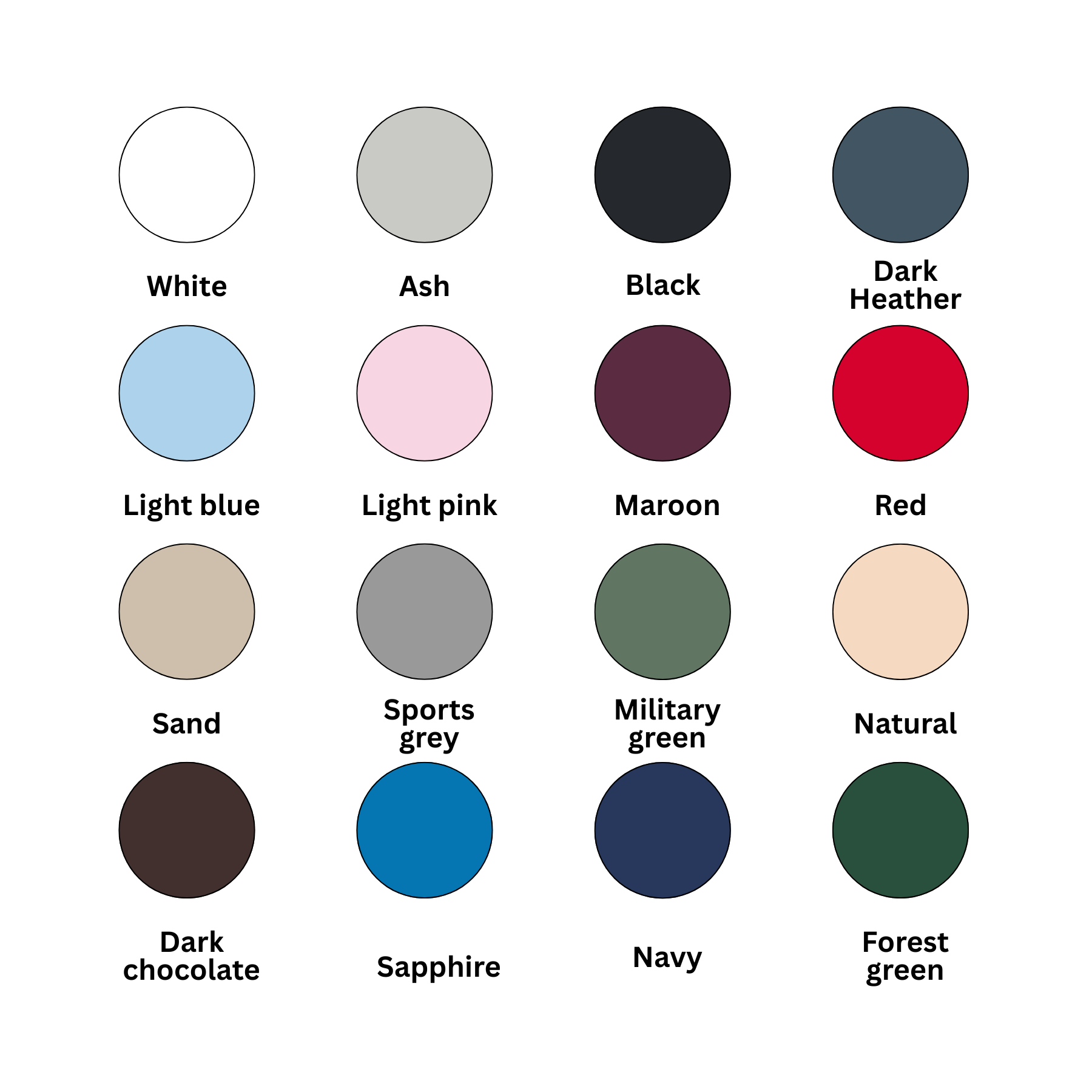 Material: Primarily 100% cotton (5.3 oz/yd²); select colors are cotton/polyester blends (50/50, 90/10, or 99/1 depending on the shade).